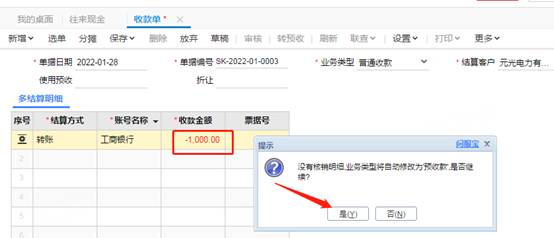 5、此时我们需要把多收的1000退回给客户,打开收款单,选择此客户输入-1000并保存,会提示自动转为预收款,点击是并审核
