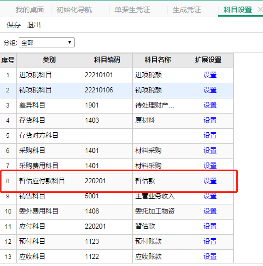 其次,在【总账】-【科目设置】中将应付暂估科目设置对应科目【应付账款-暂估款】
