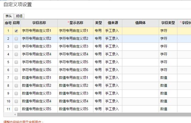 4、进入自定义项设置界面,点击“表头”页签,勾选“字符专用自定义项1”,把显示名称更改为“客户合同号”,并保存,如图下操作: