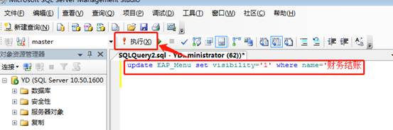 执行脚本前先进行数据备份,备份后执行下面的脚本“update EAP_Menu set visibility='1' where name='财务结账'”,如图下操作: