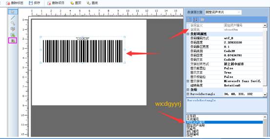 2、点击画布左侧的条码图标,到画布设计图标。并在右下角双击数据字段,绑定字段,注意:条码卡片上作为盘点扫描条码的必须是“固定资产编号”和“主条码”中的一个,根据条码格式限制,一维条码只能选择“固定资产编号”作为条码信息,二维条码可选择“固定资产编号”和“主条码”中的任一个作为条码信息。