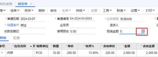2、客户直接给了现金或者转账付款,此时可点击表头现结金额后面的放大镜,如图下: