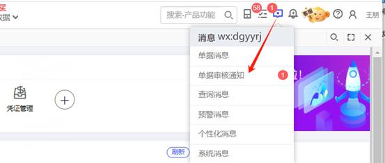 4、审核后系统会自动生成付款申请单,此付款申请单消息会发送给财务人员来审核,当财务人员登录系统时就会有单据审核通知(APP也有审核通知),如图下: