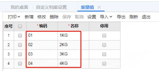 6、点击新增,录入档案编码与档案名称“重量值”并保存,如图下: