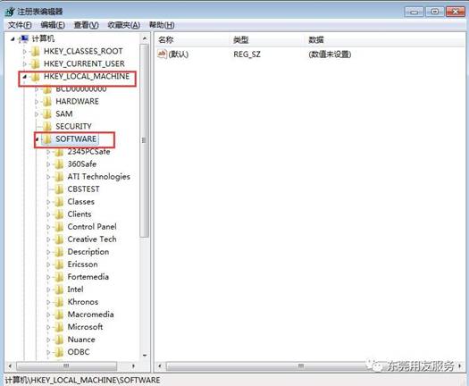 2.打开注册表编辑器,左侧有一个 HKEY_LOCAL_MACHINE 注册表项,双击 HKEY_LOCAL_MACHINE 这个注册表项目,再找到下级的 SOFTWARE ,如下图