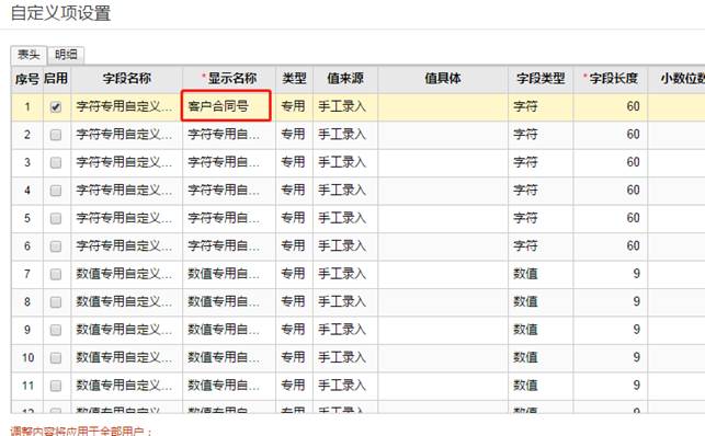 4、进入自定义项设置界面,点击“表头”页签,勾选“字符专用自定义项1”,把显示名称更改为“客户合同号”,并保存,如图下操作: