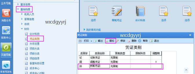 1、增加凭证类别,鼠标点击基础档案-财务-凭证类别,增加即可,如图下操作: 2、修改凭证类别,未保存过填制中的凭证需要修改凭证类别,可以在基础设置-基础档案-财务-凭证类别中将光标移到要修改的凭证类